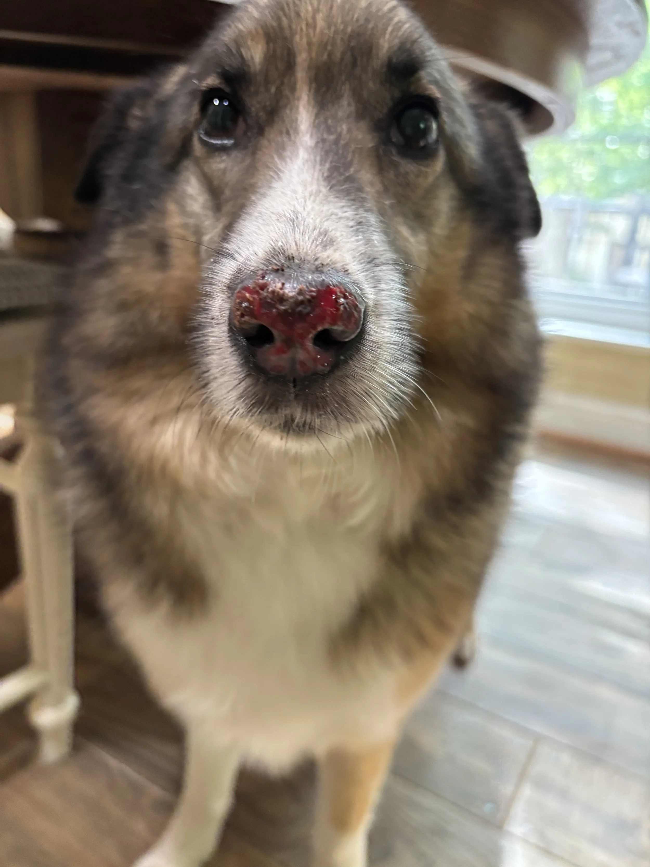 This is Bandit, one of our patients that suffers from an Autoimmune condition. The first two photos were taken on May 17th, 2025 before treatment.